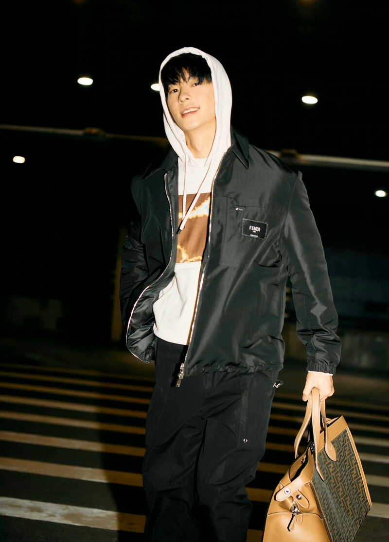 许光汉搭乘凌晨的航班,要飞往义大利米兰参加Fendi 2023秋冬系列大秀,以Fendi白色帽Tee搭配黑色夹克外套,展现大男孩的青春活力,期待光汉接下来的看秀穿搭。