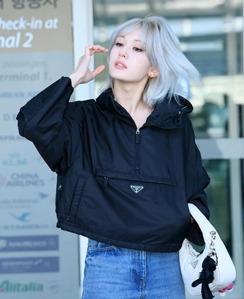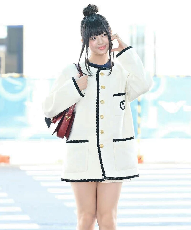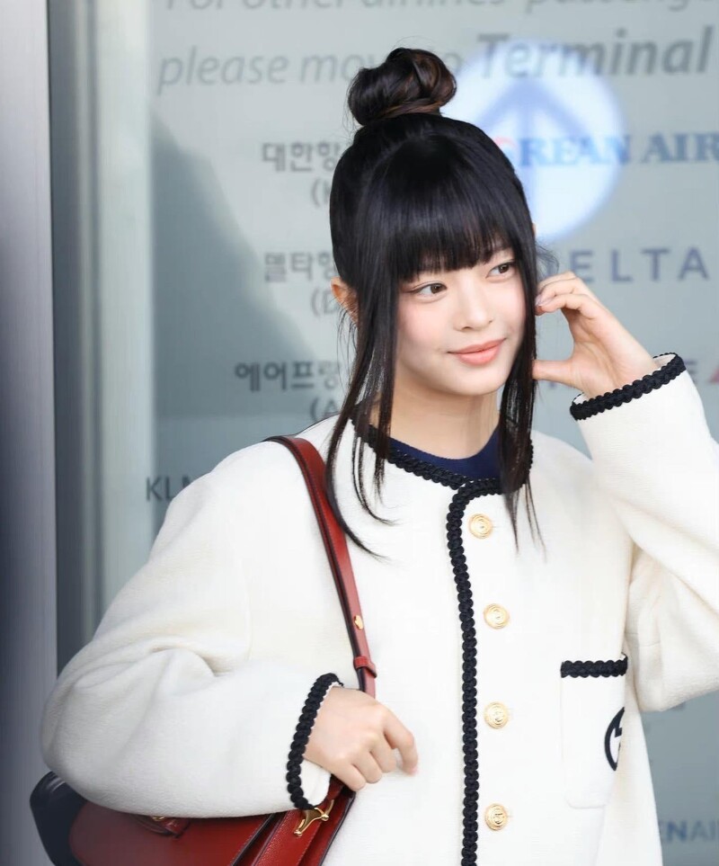 NewJeans当中首位被签下,成为Gucci品牌大使的Hanni,踏上人生第一个时装週之旅,以Gucci复古白夹克,搭配经典手袋Horsebit 1955,正在前往米兰时装週路上。