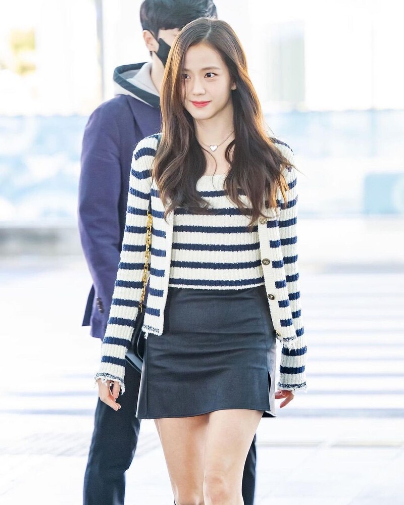 为了Michael Kors 2023秋冬大秀从仁川机场準备飞往纽约的奇恩世,选择一件黑白条纹上衣、牛仔裤,微微露出性感小蛮腰,外面罩上卡其色风衣外套,直接化身气质小姐姐,这套穿搭也很值得女孩们取经。